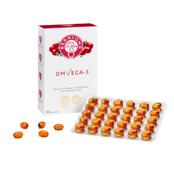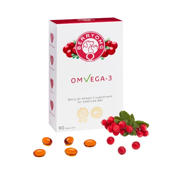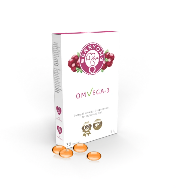 BERRYOMG® OMvEGA-3 on kotimainen, täysin kasvipohjainen omega-3-ravintolisä, joka tukee lemmikin ihon, turkin ja nivelten hyvinvointia. Tuote on kehitetty erityisesti koirille ja kissoille, joille kalaöljyvalmisteet eivät sovi tai aiheuttavat närästystä. Valmistettu pohjoisen luonnossa kasvaneista puolukoista – kapselimuoto takaa helpon annostelun ja hyvän siedettävyyden myös herkille lemmikeille.
