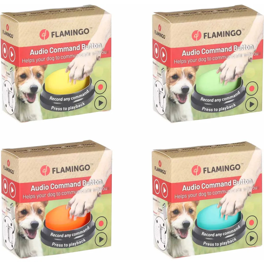 Flamingo Tallentava Kommunikaatiopainike avaa uuden tavan kommunikoida koirasi kanssa! Tällä äänipainikkeella voit tallentaa erilaisia viestejä ja opettaa koirasi kertomaan tarpeistaan tai toiveistaan – esimerkiksi ulos, ruokaa, leikkiä tai muuta tärkeää. Käytä useampaa painiketta eri tarkoituksiin ja rakenna oma "kielesi" koirasi kanssa!