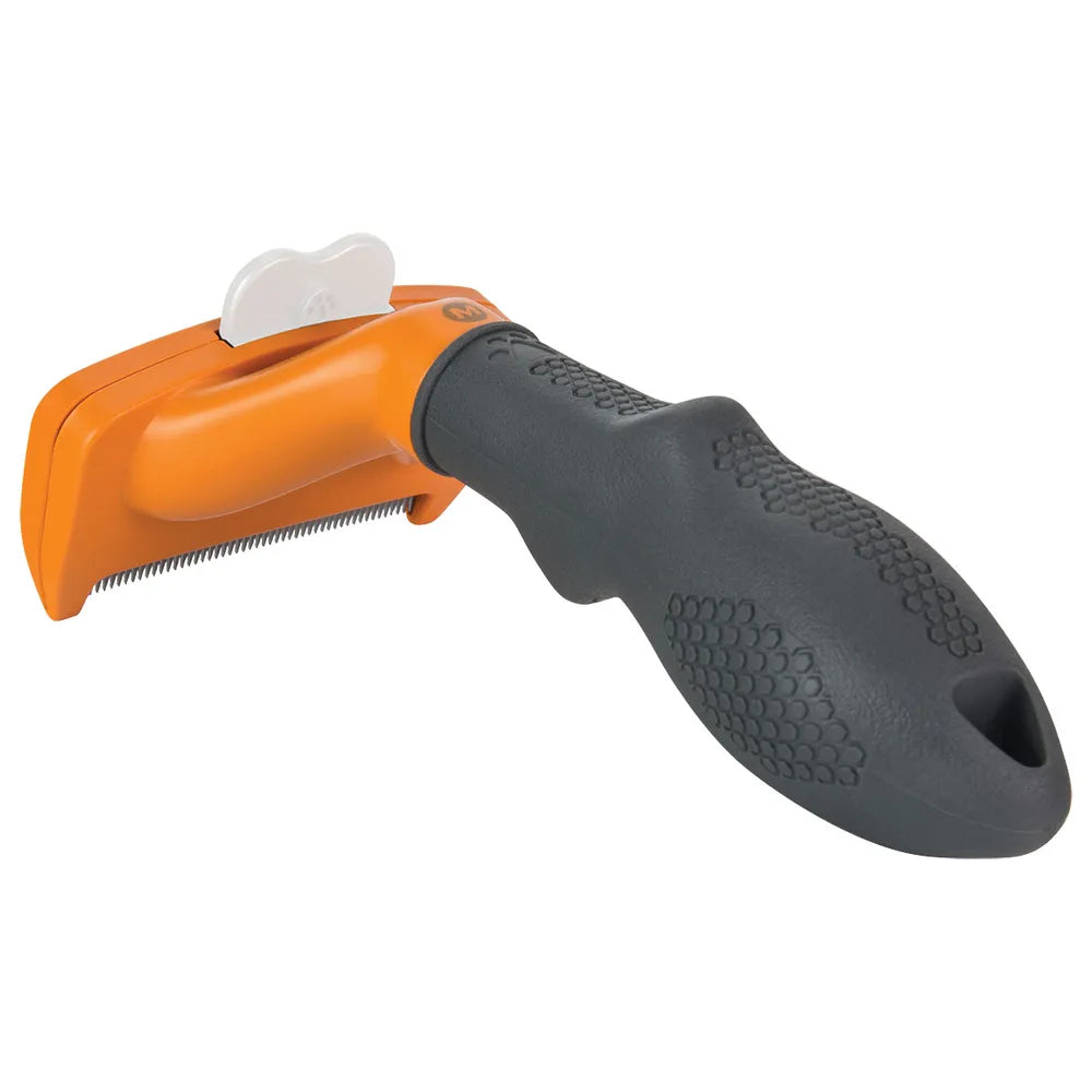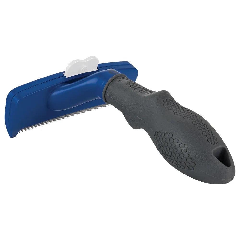 Kaareva reuna mukautuu koiran vartalon muotoihin ja Skin Guard -reunat suojaavat ihoa. Ergonominen, liukumaton kahva tekee harjaamisesta mukavaa ja turvallista. FURejector-painikkeella irtokarvat irtoavat helposti harjasta. Reunasuojus suojaa terää säilytyksen aikana.