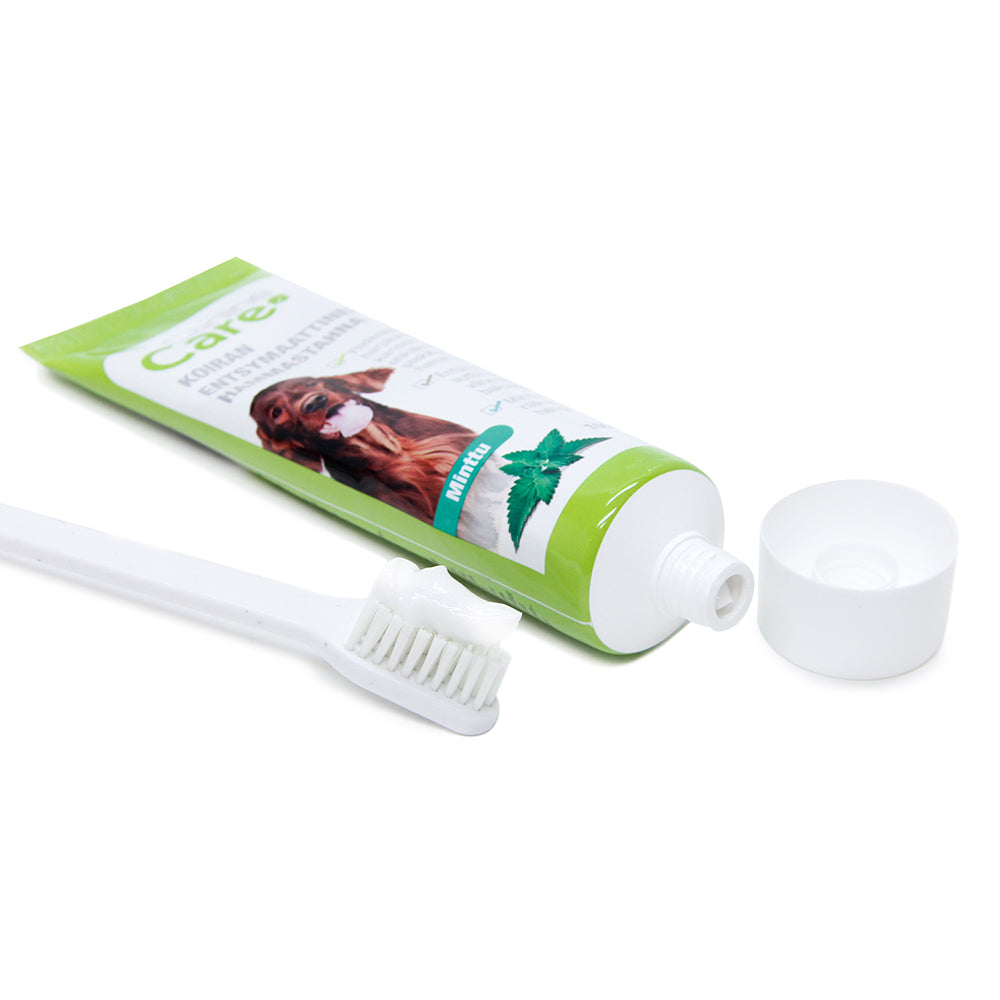 CanineCare Hammastahnan sisältämät entsyymit auttavat tehokkaasti vähentämään bakteereja ja yhdessä harjauksen kanssa poistamaan plakkia sekä ehkäisemään hammaskiven muodostumista. Tahna on helppo ja siisti käyttää, sillä se ei vaahtoa eikä lemmikin suuta tarvitse huuhtoa hammaspesun jälkeen. Piristävä mintun maku viimeistelee raikkaan hengityksen!