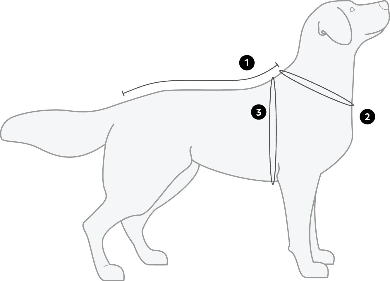 Oman koirasi mittaaminen on helpoin ja varmin tapa löytää kerralla sopiva varuste. Seuraa vain yllä olevia ohjeita ja vertaa mittoja haluamasi tuotteen kokotaulukkoon. Helppo nakki!