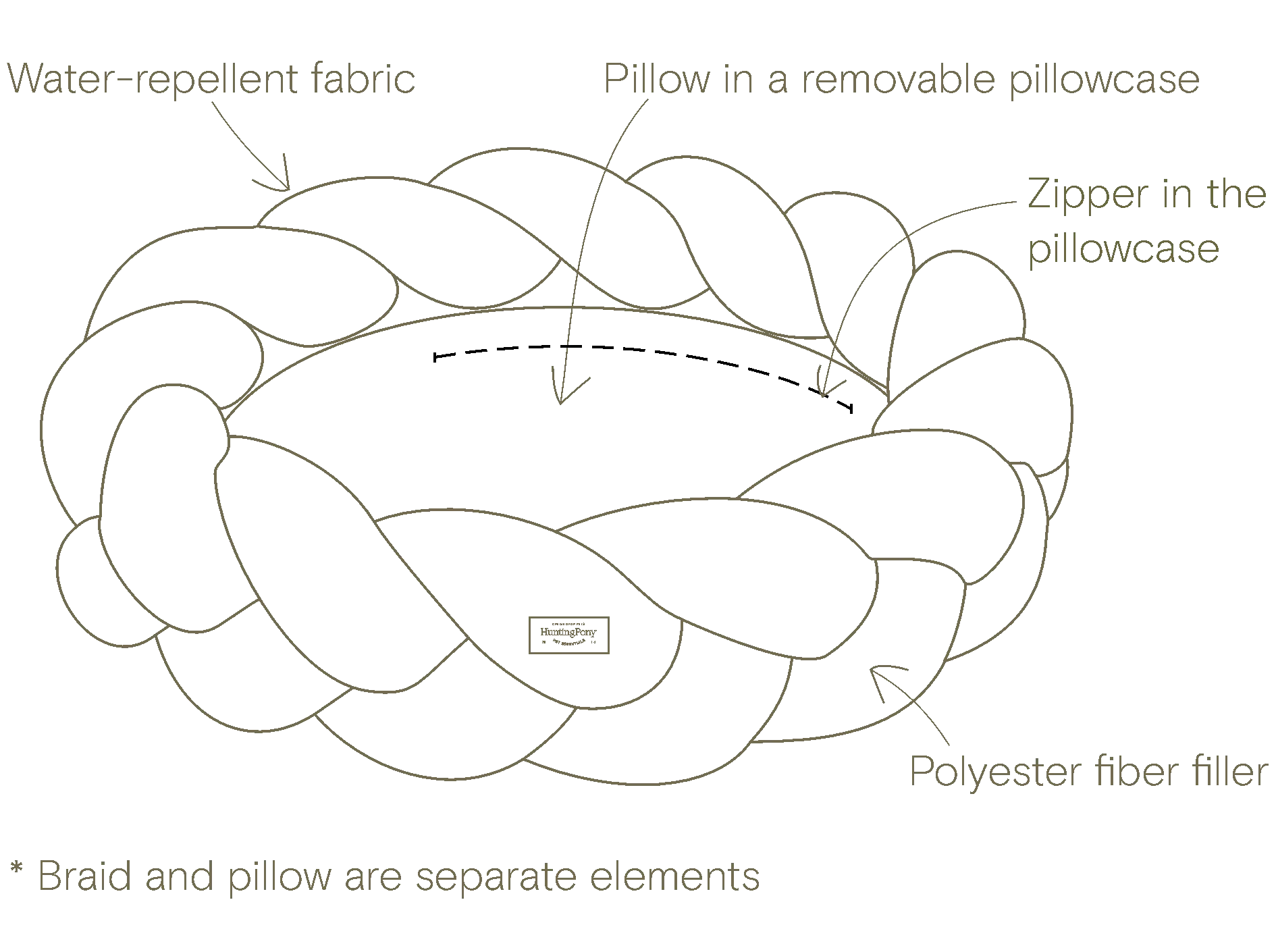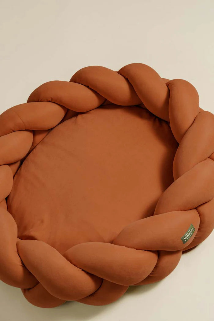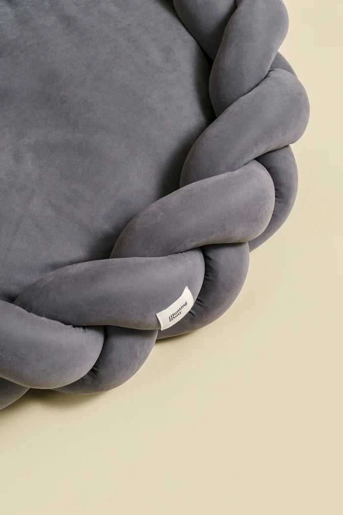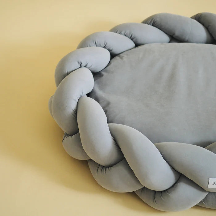 Pedin palmikkoreunus on irrallinen ja voit halutessasi käyttää vain sisätyynyä erikseen vaikka reissussa. Sisätyynyn täyte on valmistettu kierrätetystä tekstiilikuidusta. Pedit valmistetaan käsityönä Euroopassa.