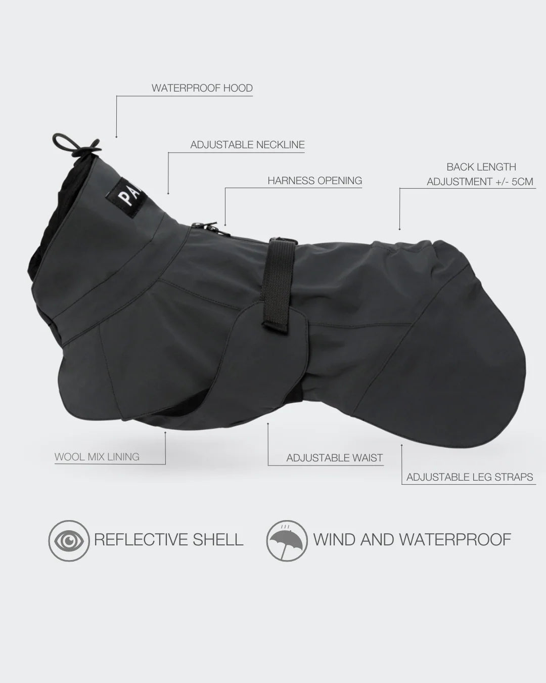 PAIKKA Visibility Harmaa Sadetakki: Täysin heijastava, vedenpitävä jokasään koirantakki – näkyvyyttä, lämpöä ja suojaa kaikissa keleissä! Säädettävä istuvuus ja villasekoitevuori.