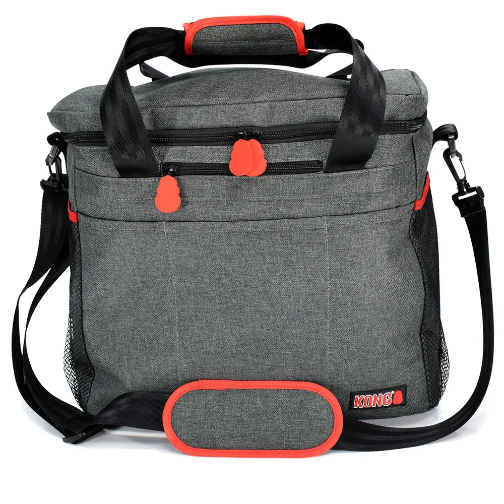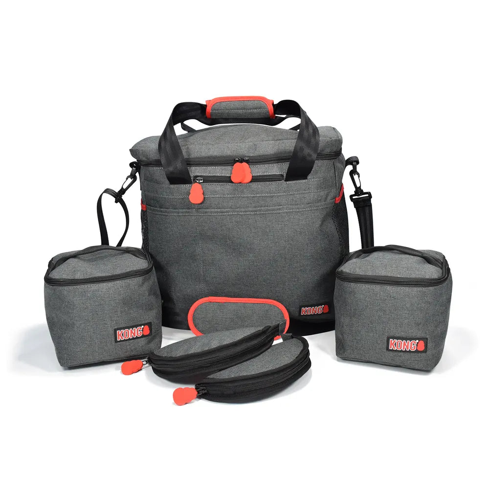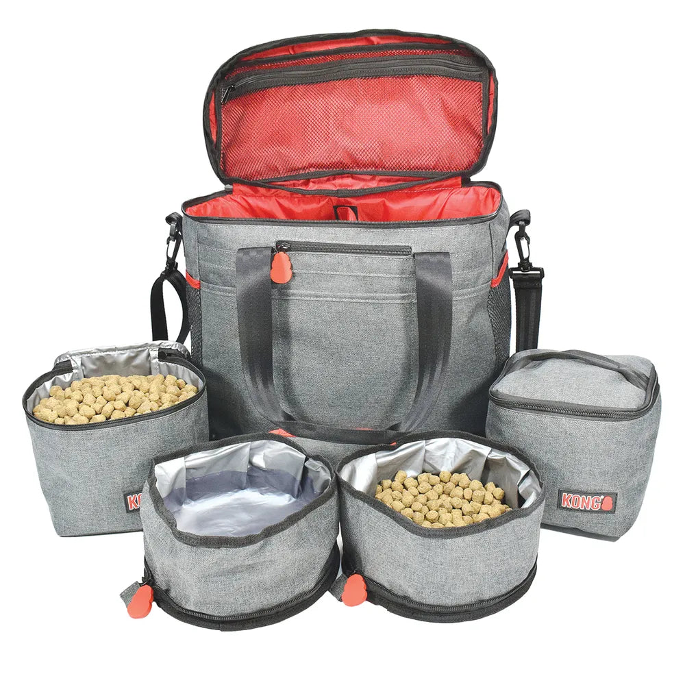 Kong 5- osainen matkakassi setti on käytännöllinen ja monipuolinen koiranomistajille, jotka haluavat tehdä reissuista vaivattomia. Settiin kuuluu kaksi elintarvikelaatuisesta materiaalista valmistettua ruokasäkkiä (3,5 L) sekä kaksi taitettavaa, vetoketjullista ruokakuppia (2 L). Laukussa on useita sisä- ja ulkotaskuja, joten kaikki tarpeellinen pysyy järjestyksessä. Vesiä hylkivä ja helposti pestävä materiaali tekee laukusta täydellisen kumppanin niin viikonloppureissuille kuin pidemmillekin matkoille.