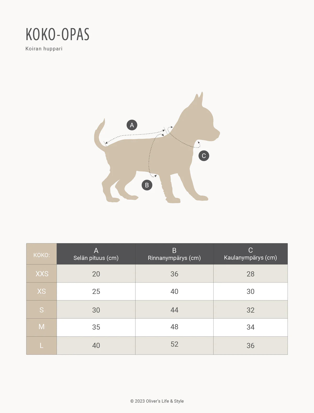 Hyvin istuva huppari on koiralle mukava käyttää. Mittaa ennen tilaamista: