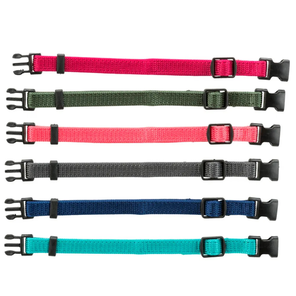 Kevyet merkkaus- ja harjoituspannat pienille koiranpennuille. Turvalukolliset, vetämällä aukeavat kevyet merkkaus- ja harjoituspannat pienille koiranpennuille kasvattajalla. Kestävää, litteää nylonia. Pannoissa ei ole D-lenkkiä taluttimelle. Portaattomasti säädettävä panta kasvaa pennun mukana. Kussakin setissä on kuusi eri väristä pantaa.